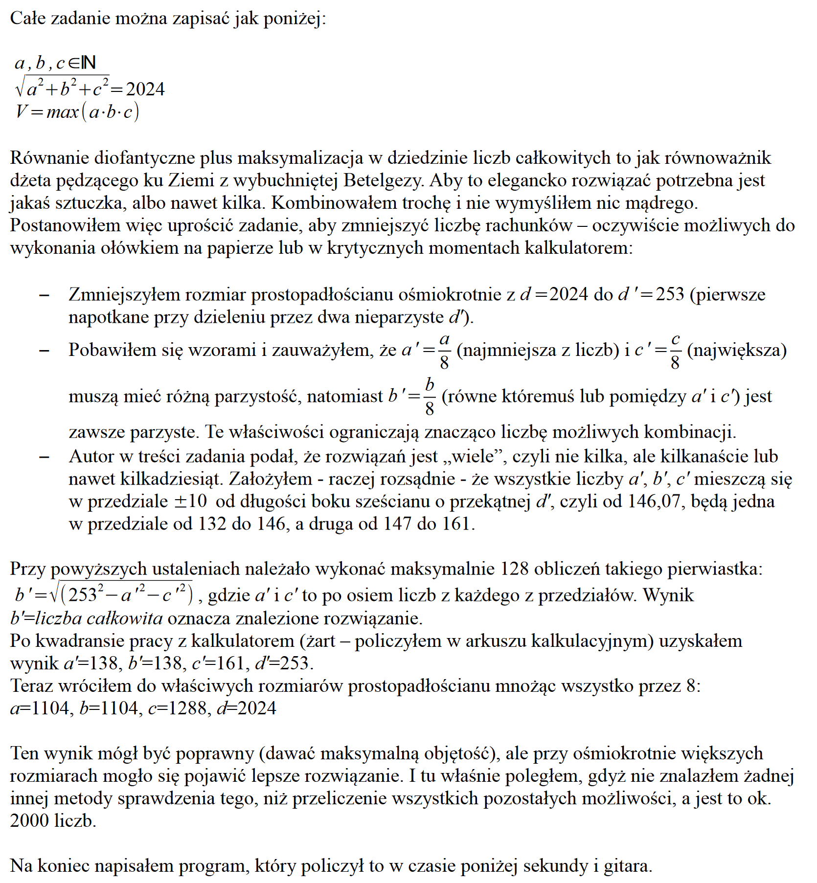 Zaczniemy od prostej matematyki. Z Pitagorasa mamy: $$a^2+b^2+c^2=p^2$$ Skoro p=2024, to szukamy trójki liczb (a, b, c) takich, że suma ich kwadratów wynosi 4096576. Pamiętajmy jednak, że mamy do dyspozycji wyłącznie kartkę i ołówek. Szukanie takiej trójki może nam więc trochę zająć...