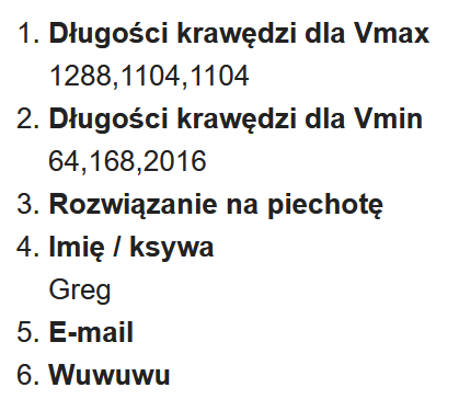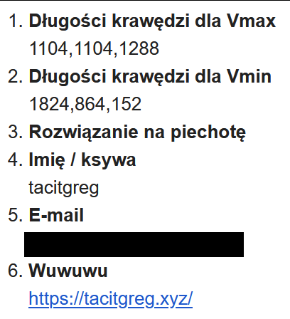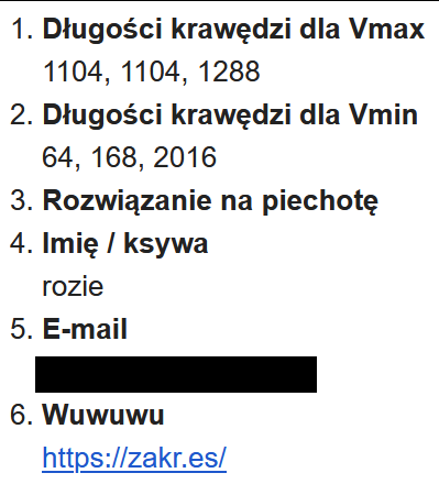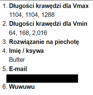 1Jako pierwszy odezwał się tacitgreg, którego odpowiedź na pytanie główne jest poprawna, bonusowe - niepoprawna, a zadanie "na piechotę" w ogóle nie ruszone. Nie zaliczam (acz strona www imponująca!)