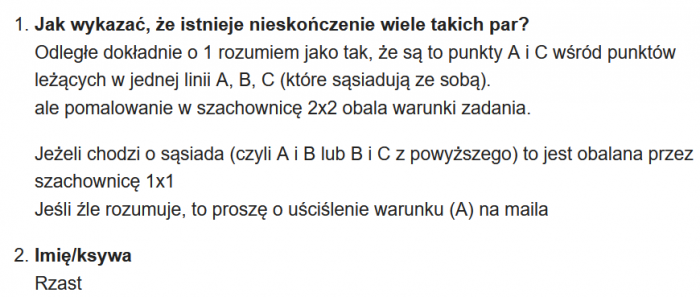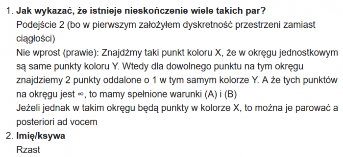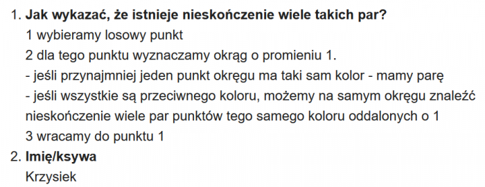 W zagadce chodziło o to, aby udowodnić, że na płaszczyźnie składającej się wyłącznie z białych i czarnych punktów istnieje nieskończenie wiele par punktów o tym samym kolorze odległych od siebie o 1.