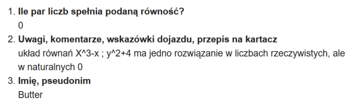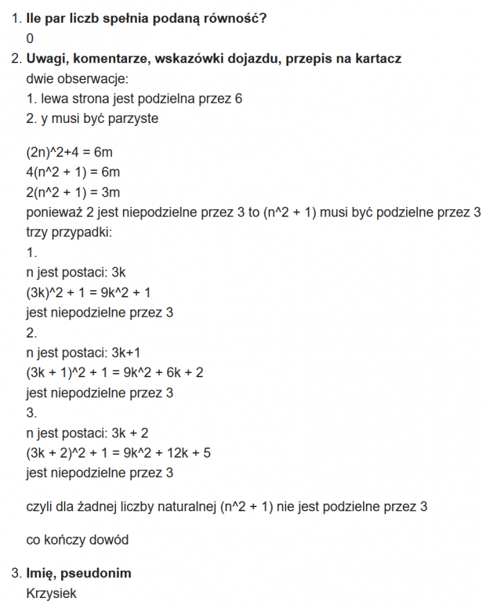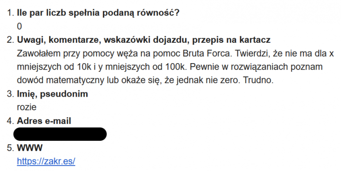 3Nazajutrz około południa swoją odpowiedź przysłał Waldek, który jako pierwszy z rozwiązujących przedstawił rozwiązanie formalne, w zasadzie identyczne z moim tylko dużo porządniej sformułowane. Naturalnie - zaliczam.