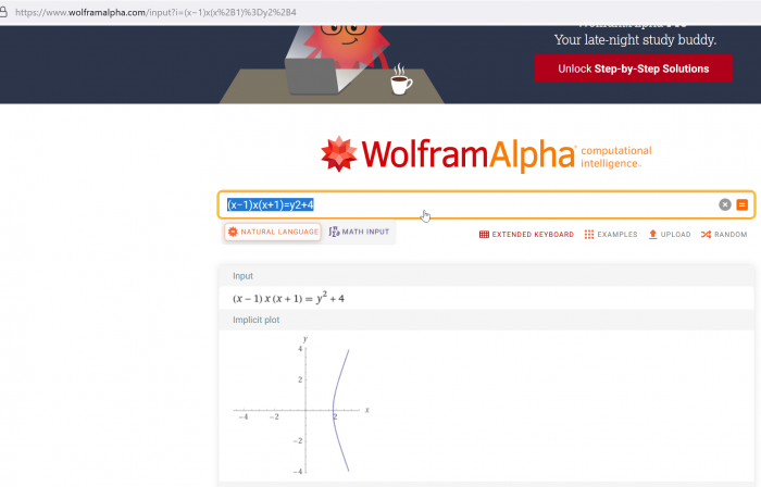 Przypuszczam, że Rzast wykonał kopiuj - wklej z mojego wpisu do Wolfram Alpha i mu się przy tej okazji rozjechały jakieś elementy. Musiał to jednak zrobić w wyjątkowo kreatywny sposób, bo spróbowałem i chociaż przy kopiowaniu "zgubił" się operator potęgowania - a więc równość przeniosła się do Wolframa jako (x−1)x(x+1)=y2+4 - to mimo to Wolfram inteligentnie założył, że "y2" oznacza \(y^2\) i podał poprawną odpowiedź: