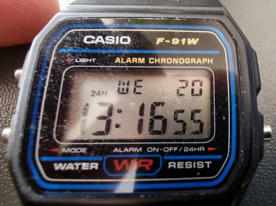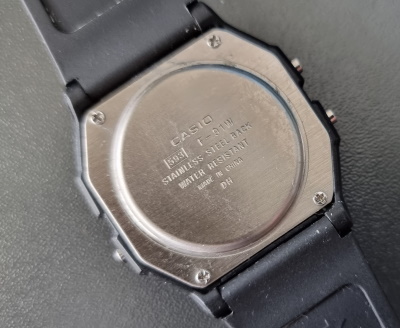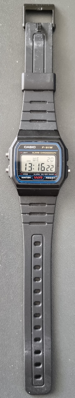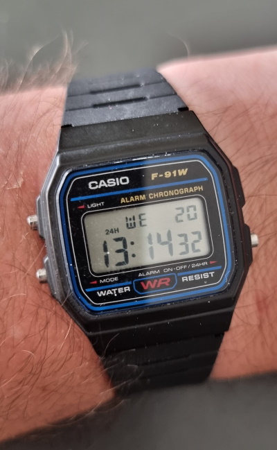 Cudeńko nazywa się Casio F-91W. Wszedł na rynek w 1989 roku (33 lata temu!) i został od tamtej pory sprzedany w wielu, wielu milionach egzemplarzy. Kosztuje odrobinę ponad €10 za sztukę. Pokazuje datę i godzinę, ma też alarm i stoper. Z latami przestępnymi sobie nie radzi, więc raz na cztery lata trzeba mu 1 marca zmienić datę na 1 marca.
