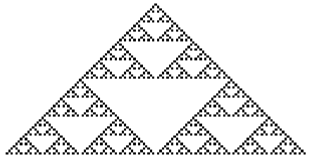 Okazuje się, że tak zdefiniowany automat komórkowy generuje nam w kolejnych pokoleniach trójkąt Sierpińskiego!