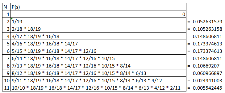 N - numer wyciąganej skarpetki, P(s) - prawdopodobieństwo sukcesu