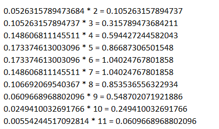 (jeżeli ktoś brzydzi się ułamkami dziesiętnymi i chciałby policzyć na piechotę z pierwszej tabelki, wyjdzie mu dokładnie \(\frac{262144}{46189}\))