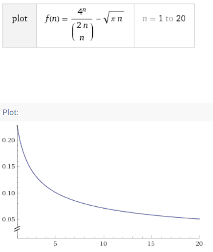 Skąd się tu pod tym pierwiastkiem wzięło Pi skoro ani szuflada nie jest okrągła ani skarpetki - proszę nie pytać, jednak przybliżenie jest bardzo dobre i tym lepsze, im większe N przyjmiemy. Sprawdźmy to sobie za pomocą Wolfram Alpha: