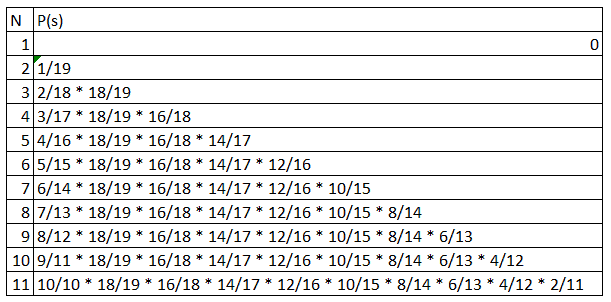 Oczywiście 1/19 (spośród 19 skarpetek pozostałych w szufladzie tylko jedna pasuje do tej już wyjętej)