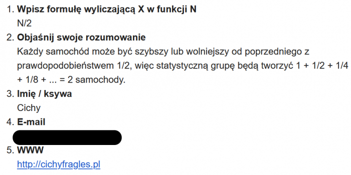 1Najpierw odezwał się Cichy, który nie zrozumiał zagadki i udzielił odpowiedzi - w dodatku nieprawidłowej - na nieco inne (choć spokrewnione) pytanie, czyli ile wynosi oczekiwana liczba aut w pojedynczej grupie.