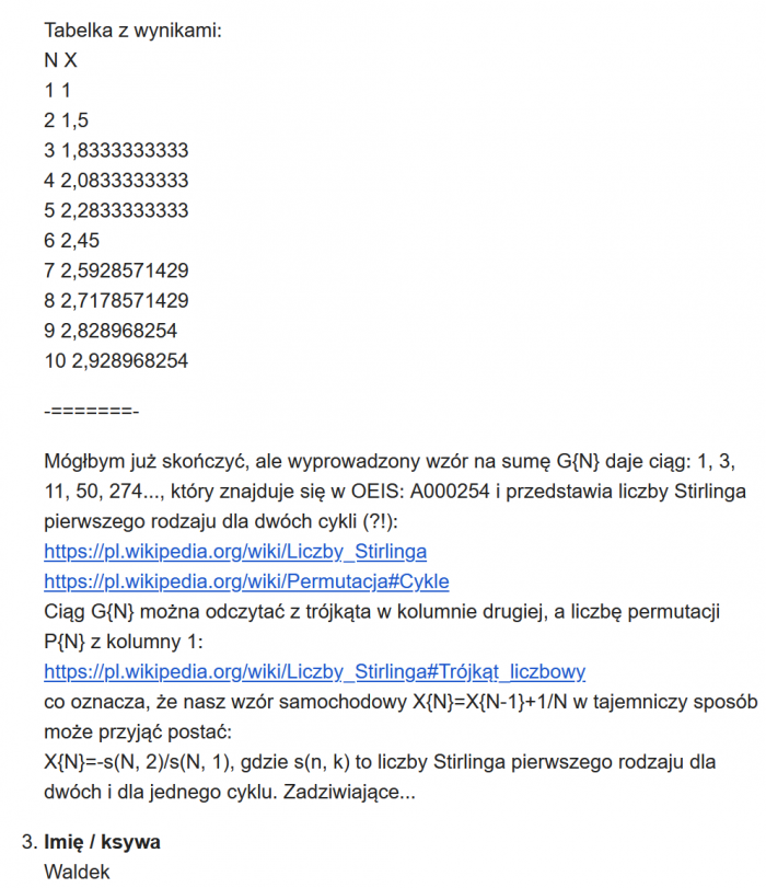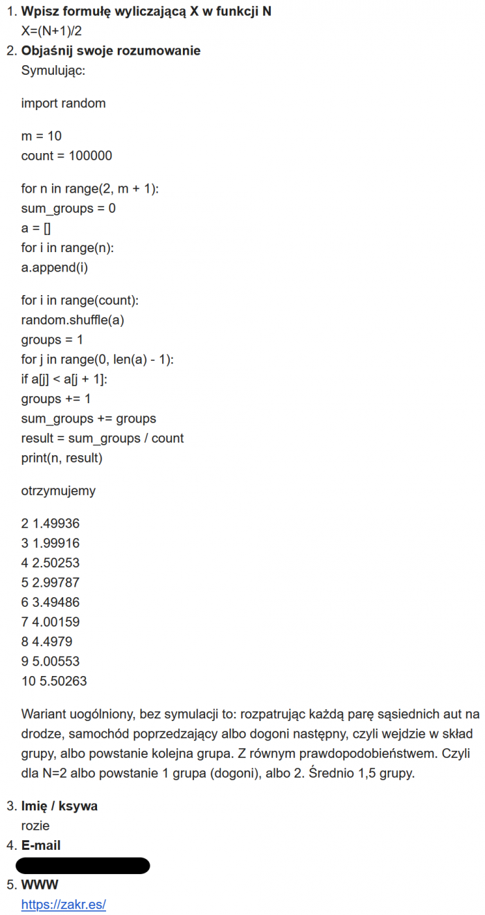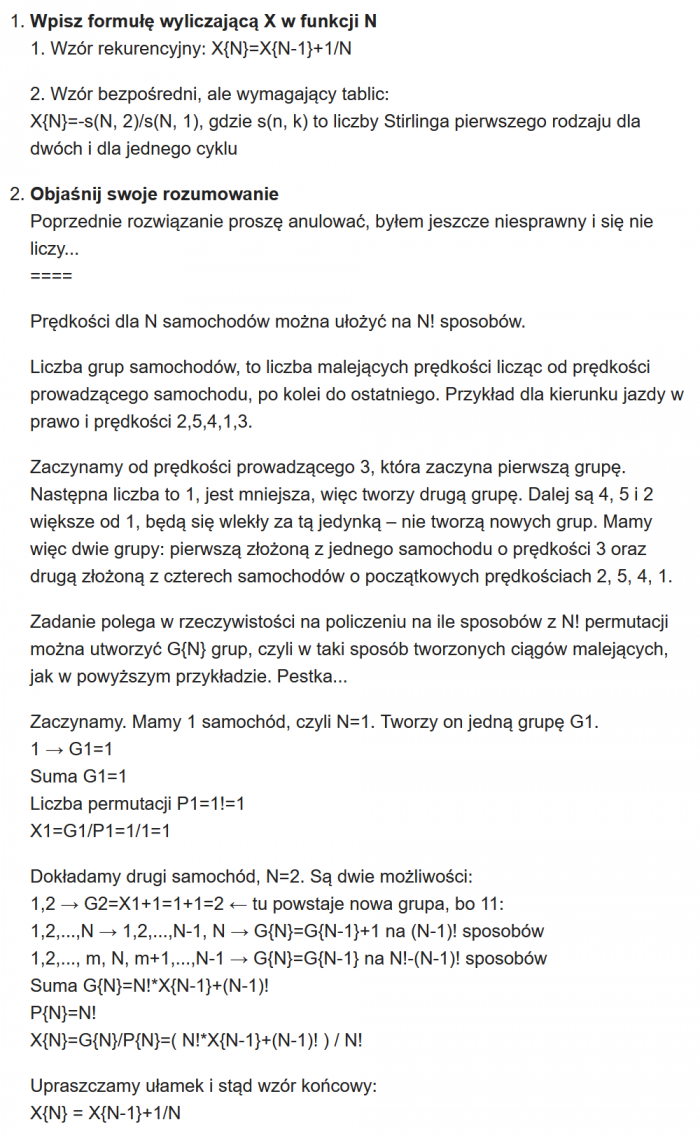 Dokładamy trzecie auto, szybsze od dwóch już jadących. Jeżeli trafi ono na sam przód (szansa: 1/3), liczba grup wzrośnie o 1. Jeżeli nie - liczba grup nie zmieni się. A skoro oczekiwana liczba grup dla N=2 wynosiła \(X=1+\frac{1}{2}\), to oczekiwana liczba grup dla N=3 będzie \(X=1+\frac{1}{2}+\frac{1}{3}\).
