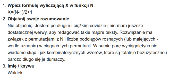 5Po kilku dniach Waldkowi przeszła pomroczność pokowidowa i zaatakował zagadkę raz jeszcze, tym razem w sposób charakterystyczny dla Waldka: nie dość, że dotarł do poprawnego wyniku (i to nieco inną trasą niż ja), to jeszcze dołożył swoje trzy grosze żeby było ciekawiej. Gratuluję!
