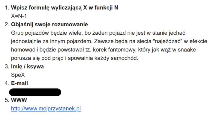 4SpeX podesłał swoje rozwiązanie nazajutrz - ale najwyraźniej przeoczył komentarz o sferycznej krowie w próżni i zaczął kombinować z teorią powstawania korków. Rzecz jasna nie zaliczam.