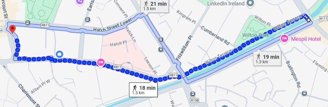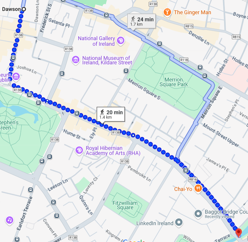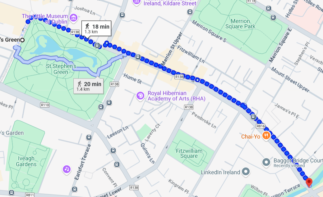 A potem zerknąłem sobie na mapę i okazało się, że ze St. Stephen's Green jest taka sama odległość, też wszystko po płaskim, a do tego mam jeszcze możliwość przejścia się przez park, który rano jest w miarę pusty i relaksujący.