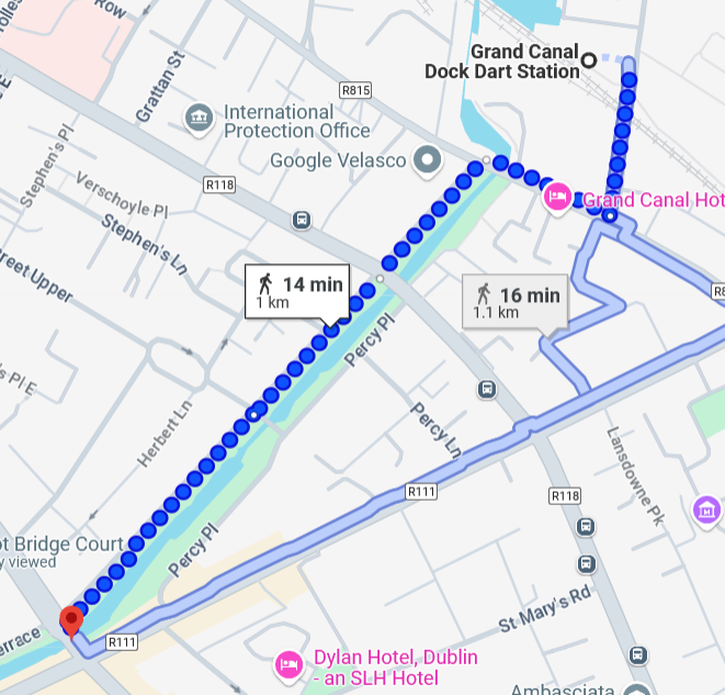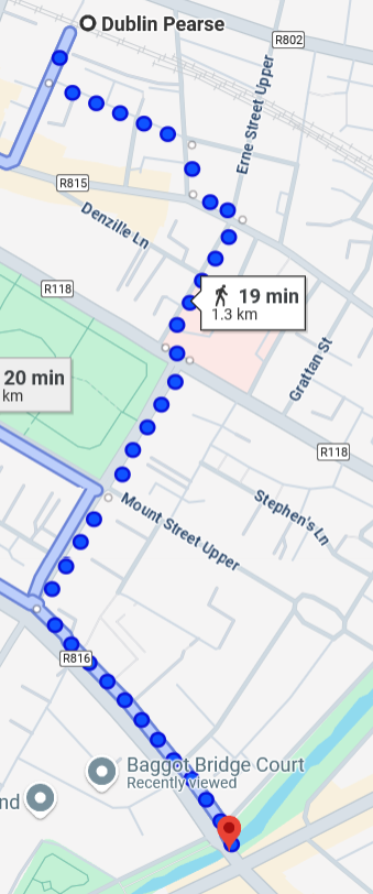 Podczas pisania tego tekstu musiałem siłą rzeczy wślipiać się w mapę. I przyważyłem - lepiej późno, niż wcale - że stacja kolejowa Pearse jest zaledwie 1.3 kilometra od Baggot Bridge!
