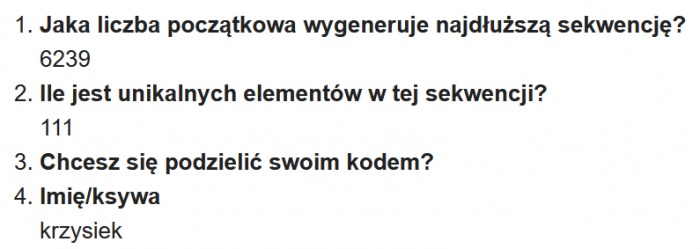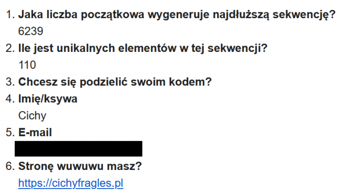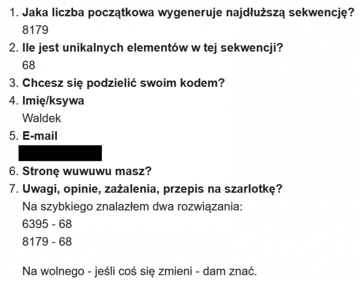 Jeszcze tego samego dnia pierwszą odpowiedź nadesłał Cichy Fragles. Bardzo chętnie bym mu zaliczył, ale się walnął o jeden w liczeniu elementów ciągu i zamiast 111 napisał 110. Zasadniczo mógłbym przyjąć, że 110 to indeks ostatniego elementu i wtedy by przeszło. Hmmm. Zaliczam na pomarańczowo 🙂