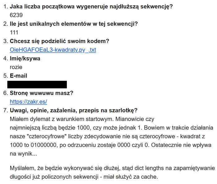 Pierwsze stuprocentowo poprawne rozwiązanie nadesłał dwa dni później Rozie, wraz z niewielkim skryptem w Pythonie. Gratuluję.