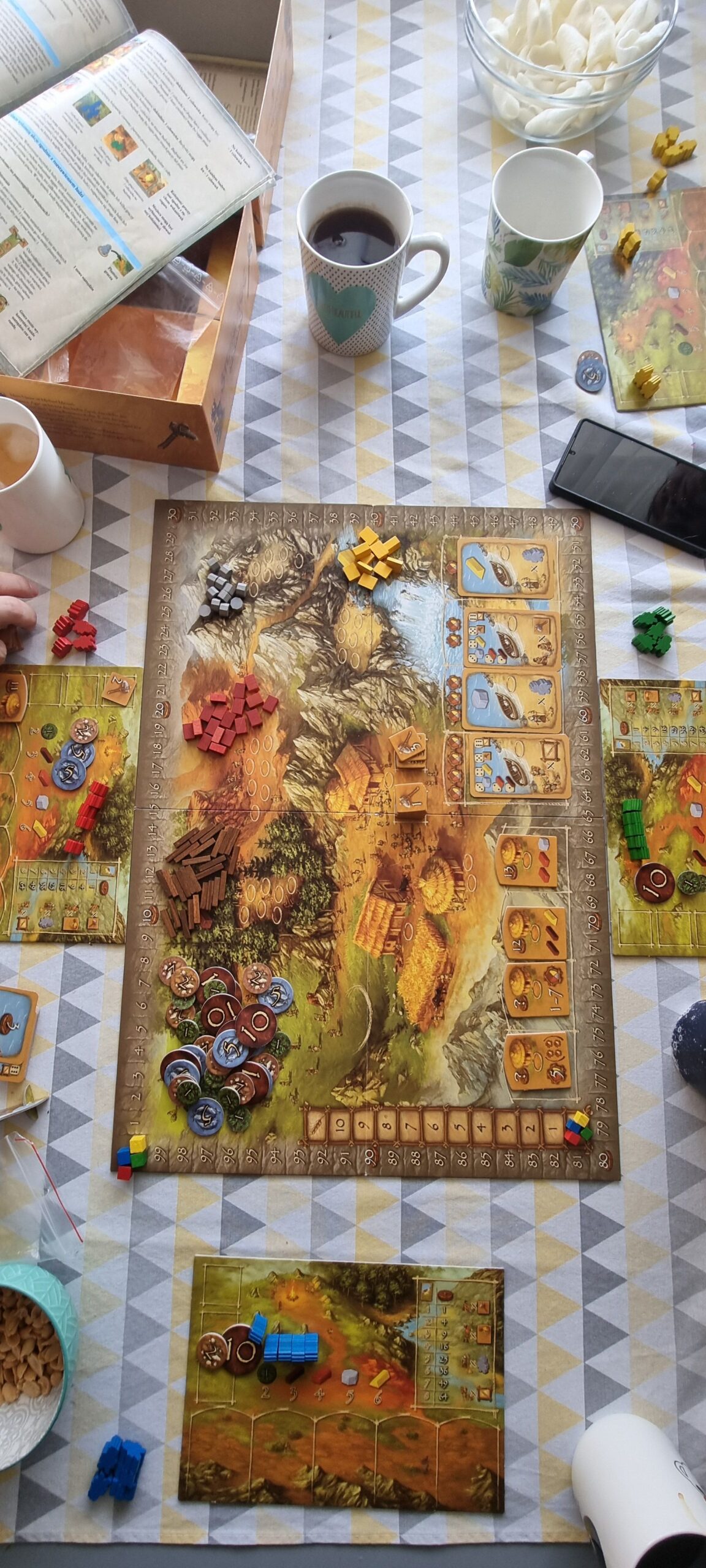 Zestaw rekwizytów jest imponujący: jedna wielka (na oko gdzieś między A3 a A2) plansza na środku stołu, do tego pięć mniejszych plansz, po jednej dla każdego gracza. Siedem (!) kości do gry - takich zwykłych, od jeden do sześć. Po dziesięć drewnianych ludzików w pięciu różnych kolorach. Garść drewna, garść cegieł, garść kamieni, garść żelaza, garść złota. Wszystko ładnie zrobione z drewna, charakterystyczne kształty i kolory, nie da się pomylić. Jest też imponujących rozmiarów kupa okrągłych żetonów o różnych rozmiarach i wartościach (1, 2, 5, 10… chyba, a może jeszcze 20? nie pamiętam już). Do tego jeszcze zestaw "domków" (w postaci prostokątnych, nieco większych żetonów). Na każdym domku jest coś narysowane w górnej i dolnej części: na górze liczba, na dole symbole surowców. Aha, i jeszcze osobny zestaw prostokątnych żetonów reprezentujących narzędzia. I jeszcze karty akcji. I pięć maleńkich, okrągłych żetonów każdy w innym kolorze. I pięć niewielkich sześcianów, każdy w innym kolorze. Do tego skórzany kubek i dodatkowy kartonik z nóżkami - podpórkami, taki, że da się go postawić w pionie. Zaprawdę, zamieszanie jak na rodzinnej wigilii - na początku kompletnie nie idzie tego ogarnąć.