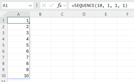 Przyjmuje ona cztery parametry wejściowe: liczba wierszy, liczba kolumn, wartość początkowa, oraz wielkość, o którą zwiększamy przy każdym kroku. Powyższy przykład pokazuje listę dziesięciu wierszy, pojedyncza kolumna, z wartościami zaczynającymi się od jedynki i zwiększającymi się o jeden.