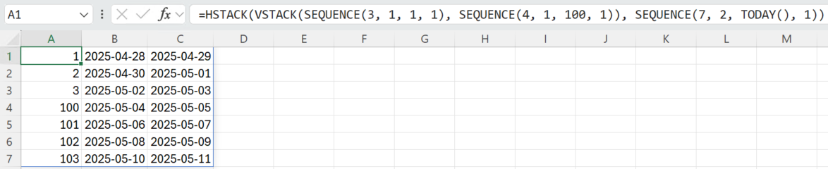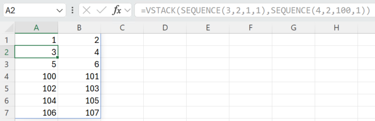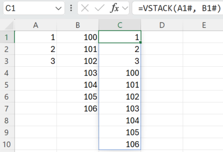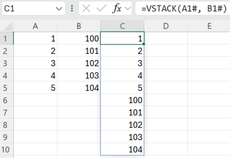 Tutaj mamy dwie listy wartości (w kolumnie A wygenerowana formułą =SEQUENCE(5, 1, 1, 1), w kolumnie B formułą =SEQUENCE(5, 1, 100, 1)). Formuła VSTACK w kolumnie C "skleja" te dwie sekwencje w pionie.