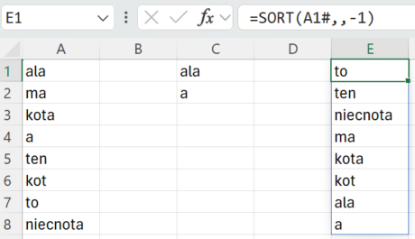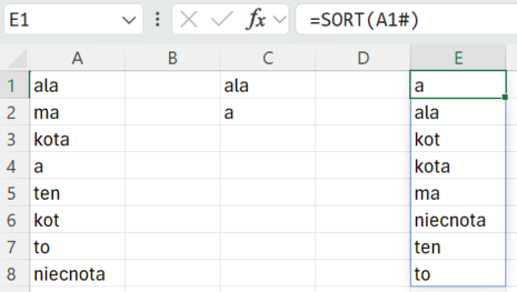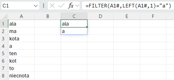 Przy okazji zauważamy, że zamiast A1, B1, używamy zapisu A1#, B1#. Dodanie kratki za adresem komórki oznacza: "wszystkie komórki wygenerowane przez formułę w tej komórce". Innymi słowy, zamiast pisać np. A1:A5 i zmieniać zakres za każdym razem kiedy formuła w kolumnie A "rozleje" się na więcej (lub mniej) komórek, po prostu wpisujemy A1#. Poniższy przykład pokazuje, że to faktycznie działa: