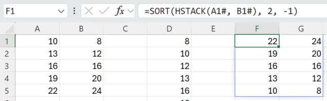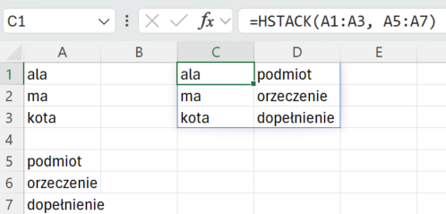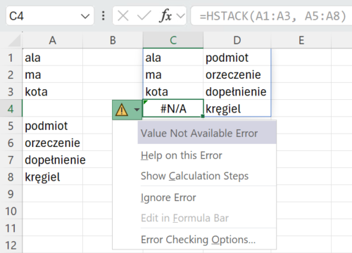 Ważne jest, żeby liczba kolumn (VSTACK) lub wierszy (HSTACK) się zgadzała, inaczej dostaniemy błąd: