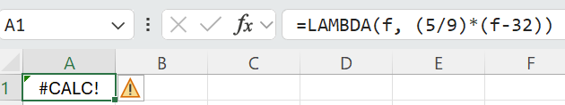 Sama LAMBDA zwróci zawsze błąd - trzeba ją jeszcze nakarmić jakimś parametrem. W przypadku powyżej funkcja przelicza z Fahrenheitów na Celsjusze. Żeby zadziałało, trzeba zrobić tak: