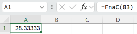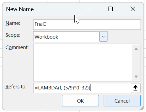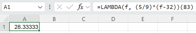 Przeliczyliśmy sobie właśnie 83F na 28.33C. Trochę bez sensu, bo zamiast tego moglibyśmy po prostu wpisać tę formułę bezpośrednio w Excela, bez żadnej głupiej lambdy.