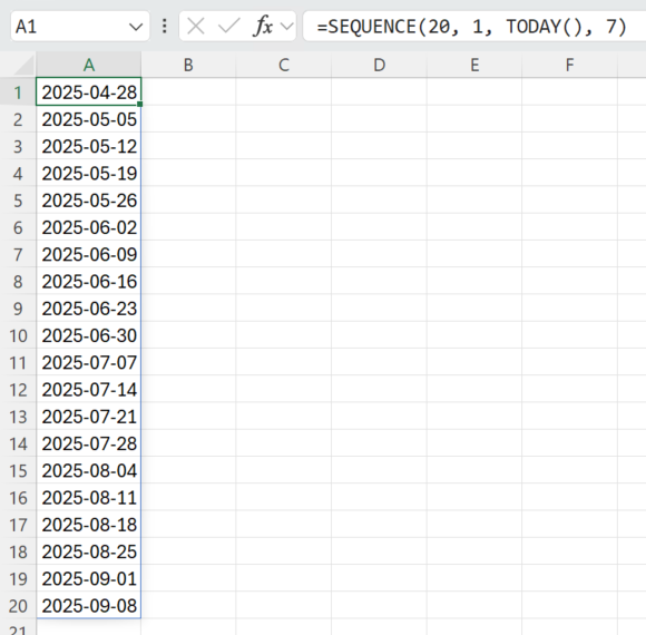A tutaj przykład jak wygenerować 20 dat, począwszy od dzisiejszej, co tydzień:
