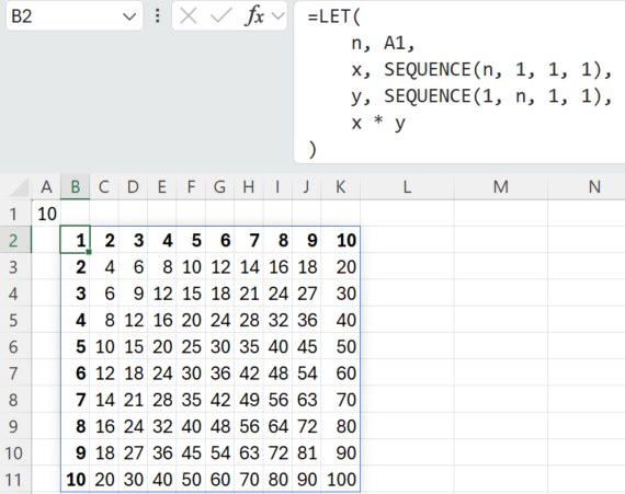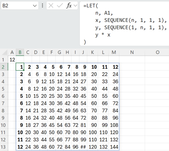 Ciekawostką jest tutaj ostatnia linijka: x*y. Ponieważ x oraz y to są listy liczb (jedna w pionie, druga w poziomie), Excel uprzejmie wykonuje tutaj mnożenie pierwszego elementu x przez pierwszy element y i umieszcza wynik w komórce (1,1), po czym powtarza to dla pozostałych kombinacji elementów. A więc nie robi mnożenia macierzy (to możemy uzyskać za pomocą MMULT), tylko zwykłe mnożenie pojedynczych liczb.
