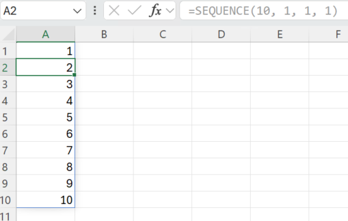 Wszystko identycznie, ale formuła w pasku na górze jest wyświetlona na szaro. Jest tak, ponieważ SEQUENCE jest formułą zwracającą wiele wartości, które zostają "rozlane" (z ang. spilling) poniżej (lub w prawo, jeżeli zażyczymy sobie wielu kolumn). Oznacza to, że w komórce A2 nie ma tak naprawdę żadnej formuły, a widoczna tam liczba (lub data) są efektem spilling z komórki powyżej.