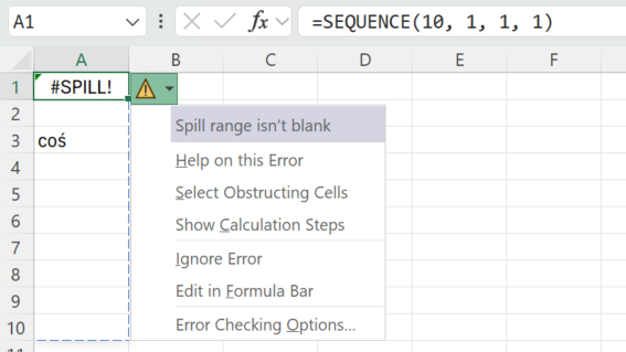 Dlatego planując arkusz z tego typu formułami (tj. używającymi spilling) musimy zawsze solidnie planować co i gdzie wpisujemy.