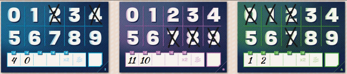 Players have a tile with permanent numbers 0-9 in front of them, an empty tile, an erasable marker, and a board for tallying points.