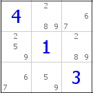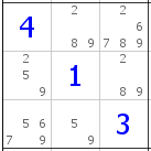 Dla uproszczenia, wpisałem już wszystkie dopuszczalne cyfry w każdej z komórek tego kwadratu. W zasadzie nic z nich na pierwszy rzut oka nie wynika - jest tylko jedna para (5-9), nie ma żadnej wspólnej trójki i tak dalej. Dupa blada, zdawałoby się.