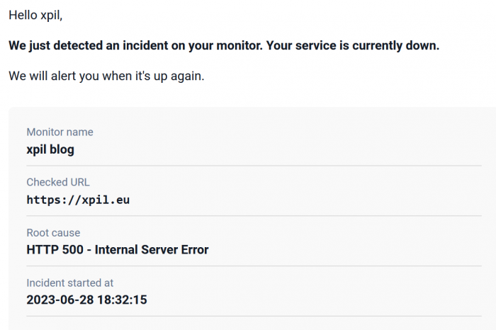 Nie dalej jak parę godzin temu na ten przykład dostałem zautomatyzowanego e-maila od usługi Uptime Robot (bardzo zacne zwierzę bajdełej, polecam), że Blogusław nie tenteges: