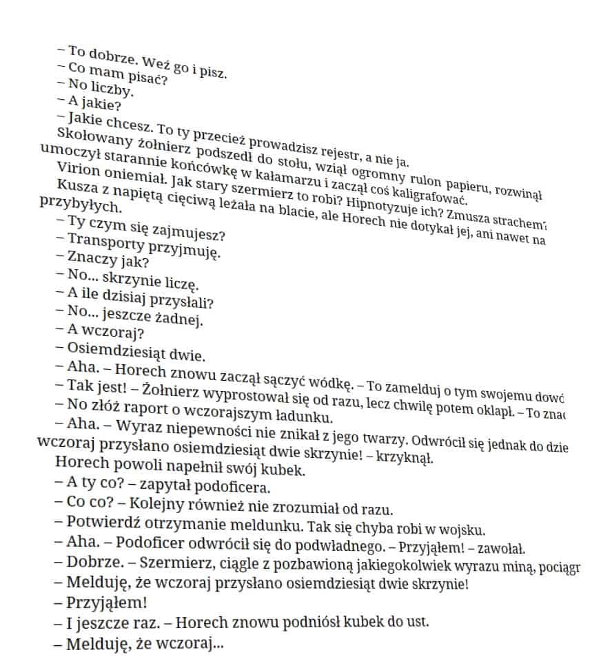 Mamy kilka wątków: "główny", czyli samego Viriona, który spotyka na swej drodze Horecha. Horech jest szermierzem natchnionym, niestety już ma mocno z górki, w dodatku ostro chleje.
