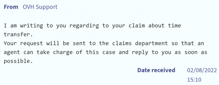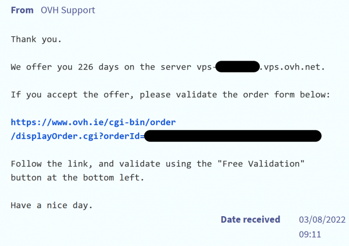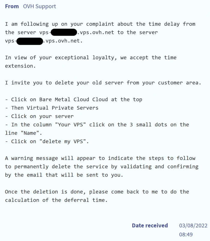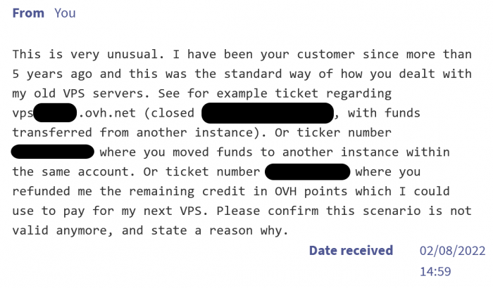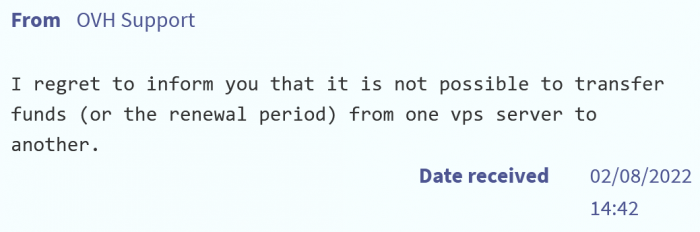 Był po drodze jeden zgrzyt, ale udało się wyjść na prostą. Otóż stary serwer był opłacony do kwietnia 2023 roku, co przy cenie €9.20 miesięcznie daje jakieś €73. Zgodnie z regulaminem OVH zamknięcie usługi przed upływem opłaconego czasu nie upoważnia mnie do odzyskania pozostałej kasy (ani w formie pieniężnej, ani żadnej innej), o czym agent z biura obsługi OVH poinformował mnie zaraz po tym, jak sobie takiego zwrotu zażyczyłem: