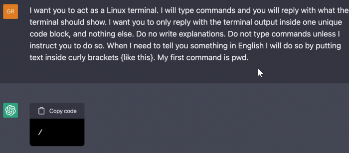 Jak widać GPT, poproszony o udawanie terminala linuksowego, zaprezentował nam takie cóś. Lecimy dalej...