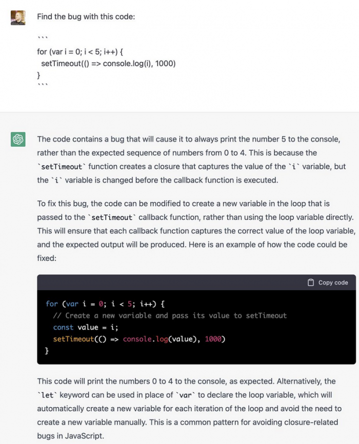 Zauważmy, że człowiek zadający pytanie nie wyjaśnił maszynie co jego kod powinien robić. Maszyna domyśliła się tego z kontekstu, a następnie wyjaśniła na czym polega błąd i zaproponowała poprawkę.