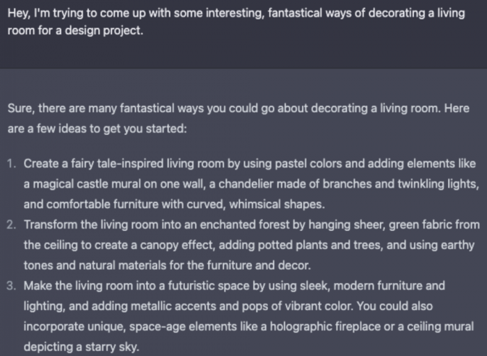 Jednak GPT nie ogranicza się wyłącznie do zagadnień związanych z programowaniem komputerów. Można go na przykład poprosić o sugestię jak udekorować salon: