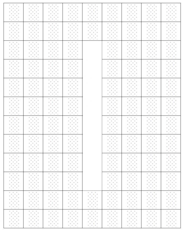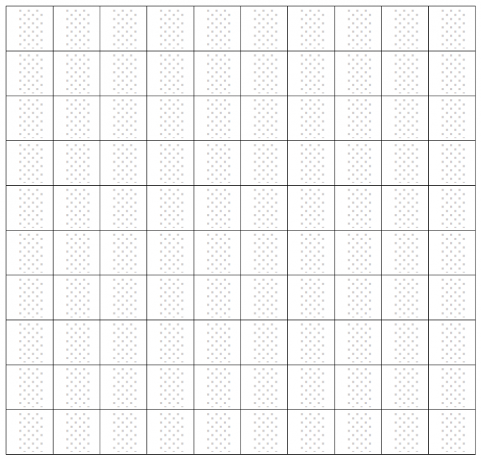 Staruszek popatrzył uważnie i po chwili przyznał żonie rację. A potem podreptał do szuflady z narzędziami (każdy ma w domu taką szufladę, prawda?), wyjął z niej nóż do cięcia dywanów, rozciął dywan na dwa identyczne kawałki (tnąc wyłącznie wzdłuż brzegów kwadratów), po czym złączył je w jeden kwadratowy dywan 10 x 10 kwadratów, o taki: