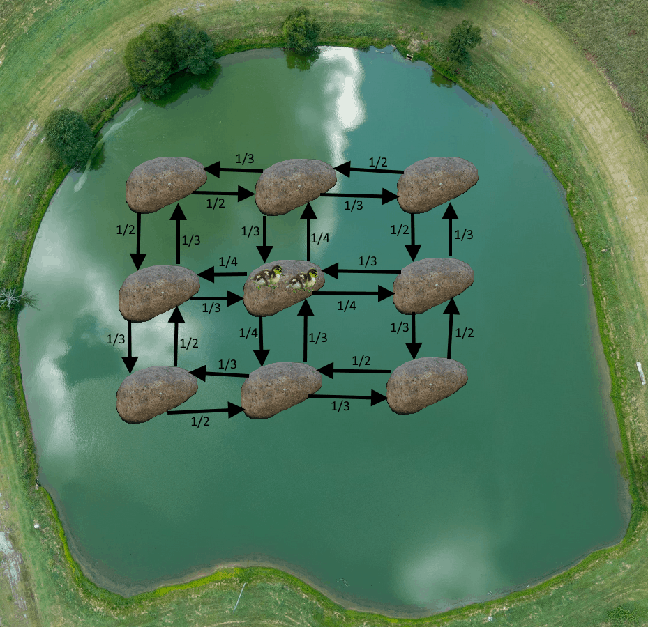 Za każdym razem po upływie minuty każda z kaczuszek, niezależnie jedna od drugiej, wybiera sobie losowo sąsiedni kamień (wyłącznie wzdłuż albo w poprzek, nie na ukos!) i na niego przepływa. Prawdopodobieństwo wybrania każdego z sąsiednich kamieni wynosi 1/4 dla kamienia środkowego, 1/3 dla czterech bocznych i 1/2 dla każdego z czterech narożnych (bo ze środka są cztery kierunki, z boków - po trzy, a z narożników tylko po dwa):