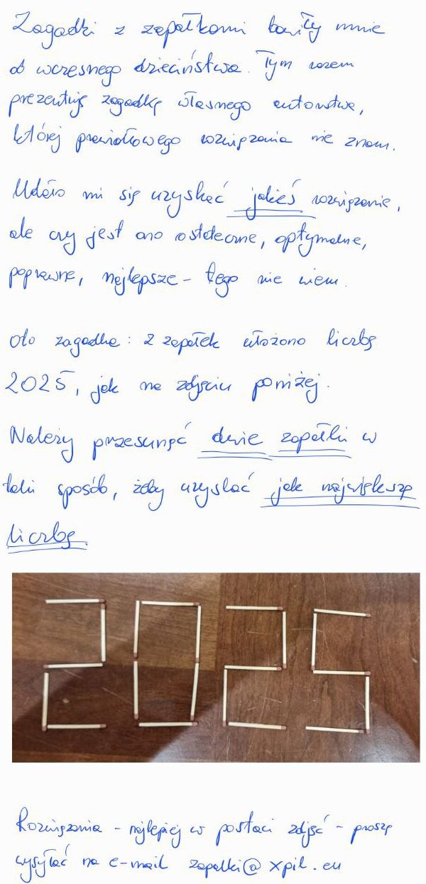 Zagadka z zapałkami 2025-02-01 krótki URL: /DCioN kategorie:Jestem, więc myślę, Serie tagi:2025, zagadka, zapałki ← Welders vs the rest of the world Denerwujące rzeczy w Sieci, których nie robię na blogu → Komentarze Włącz JavaScript, aby zobaczyć komentarze.