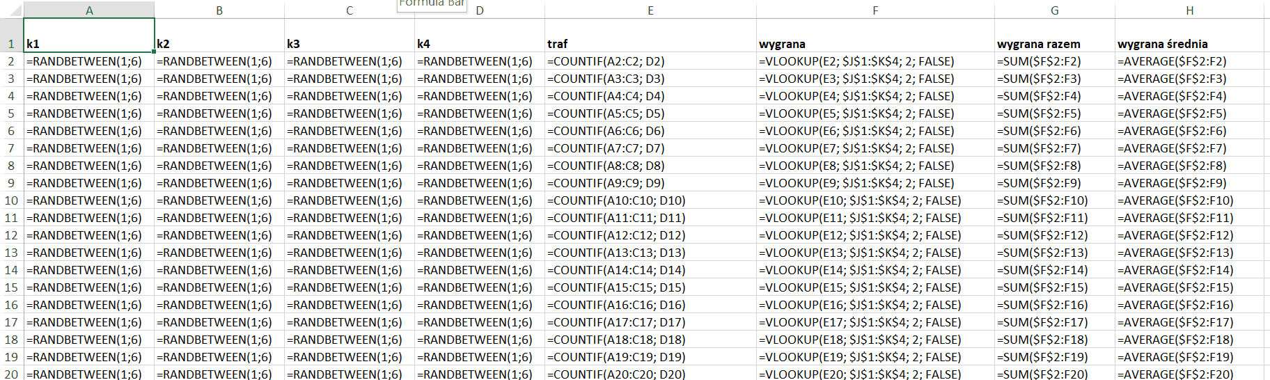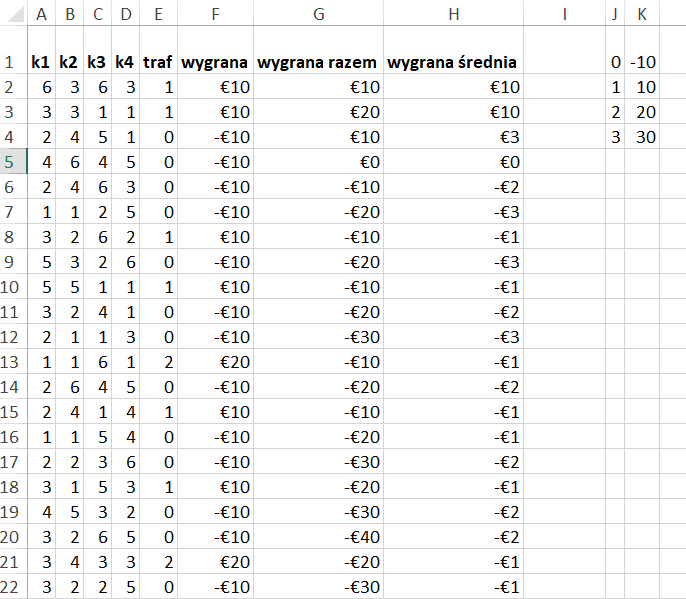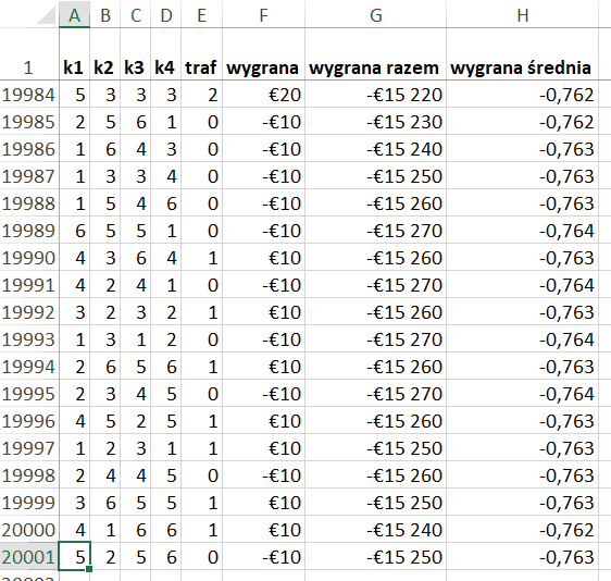 Jak widać po 20,000 gier przegraliśmy 15,250 Jerzych, czyli średnio 76 centów na partię. Prawie idealna zgodność z wynikiem teoretycznym.