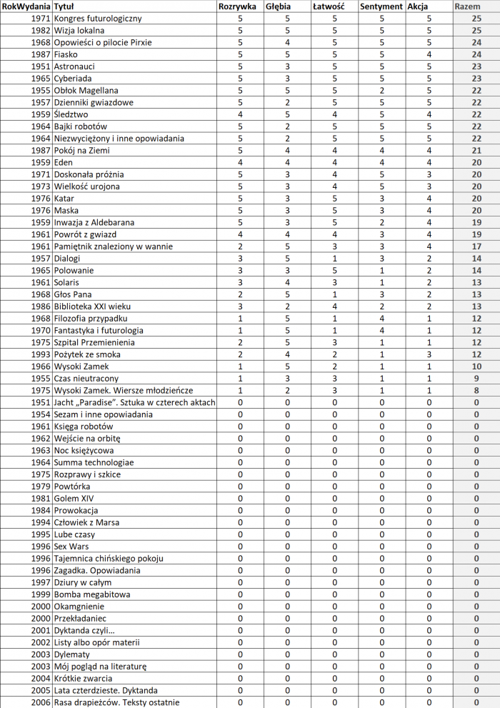Wpadło mi niedawno do głowy, żeby sporządzić sobie prywatny ranking tekstów Lema. Wziąłem Excela, wkleiłem z Wiki listę tytułów, Wymyśliłem sobie pięć atrybutów, każdej parze książka-atrybut przypisałem ocenę w skali 0-5, gdzie 0 oznacza, że książki w ogóle nie czytałem, a od 1 do 5 wiadomo.